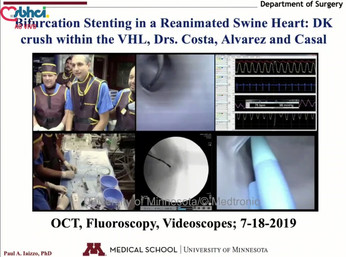 Após um breve período de discussões, tivemos a brilhante e didática demonstração ao vivo do Dr Paul Iaizzo (EUA), diretamente do laboratório Visible Heart da Universidade de Minesotta, do passo a passo da técnica provisional de implante de stent em bifurcação em um modelo de coração suíno, com impressionantes imagens.